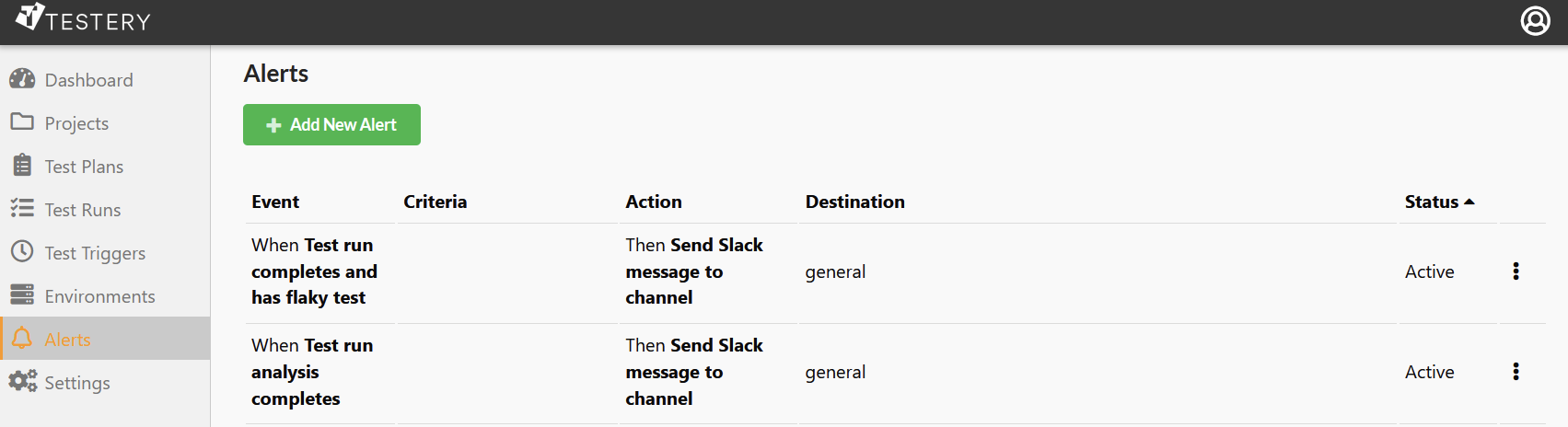 Alerts enable you to notify your team (or anyone else you want) when test runs pass, fail, or complete with any status. You can send messages to various places like Slack, Microsoft Teams, OpsGenie, or even webhooks.