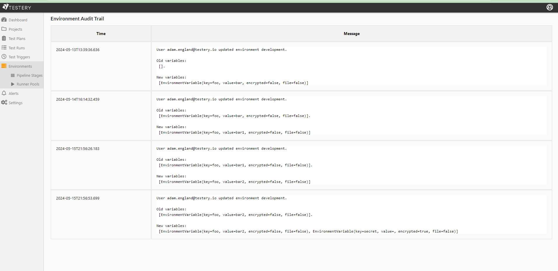 Testery provides a 90 day audit trail of changes to the variables on both Environments and Pipelines.  This will contain the time, user, and changed variables.  Any encrypted variables will not be shown in the audit log.\