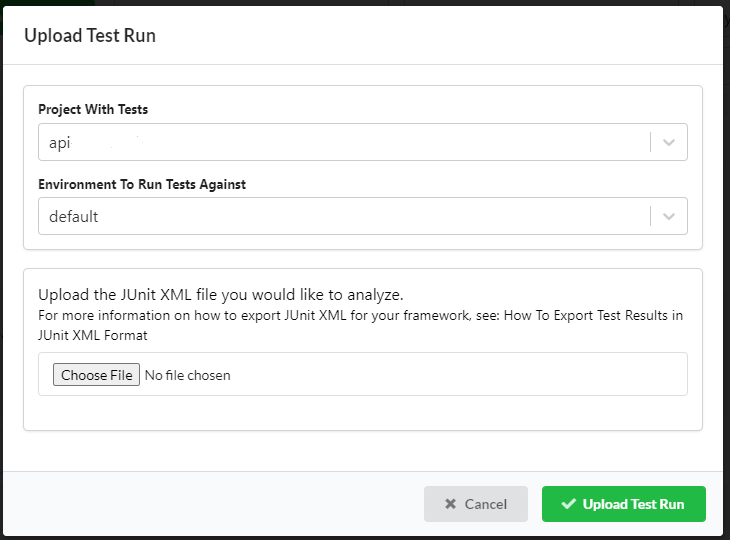 3. Select your Project and Environment and then click Choose File to upload your JUnit XML.